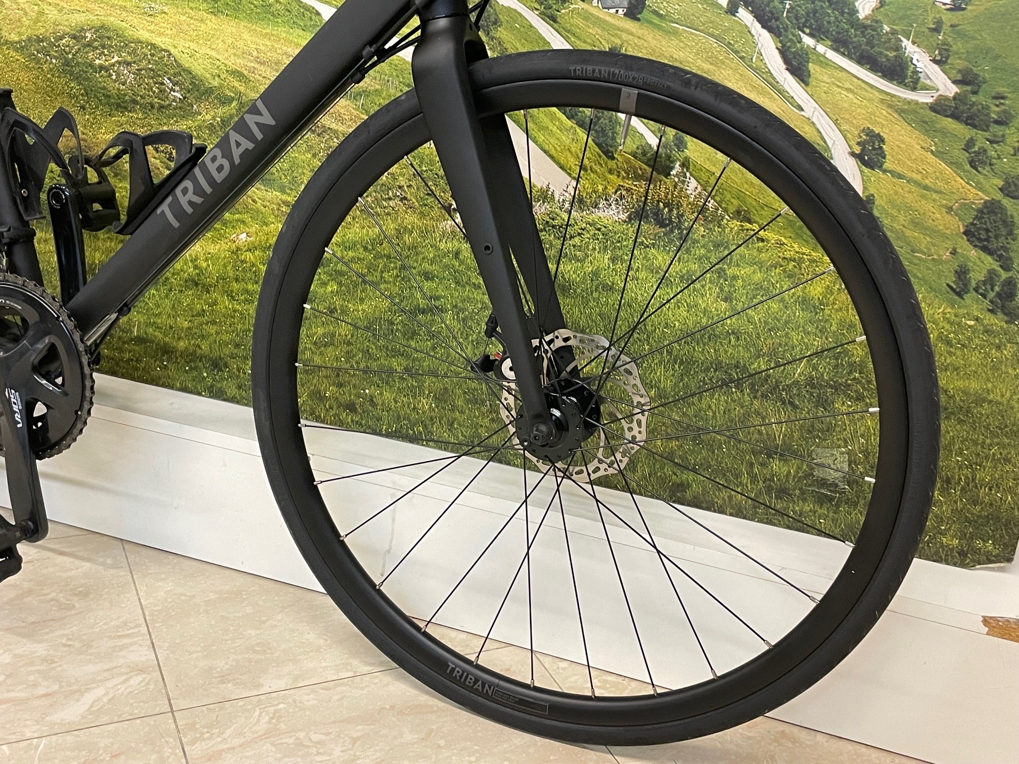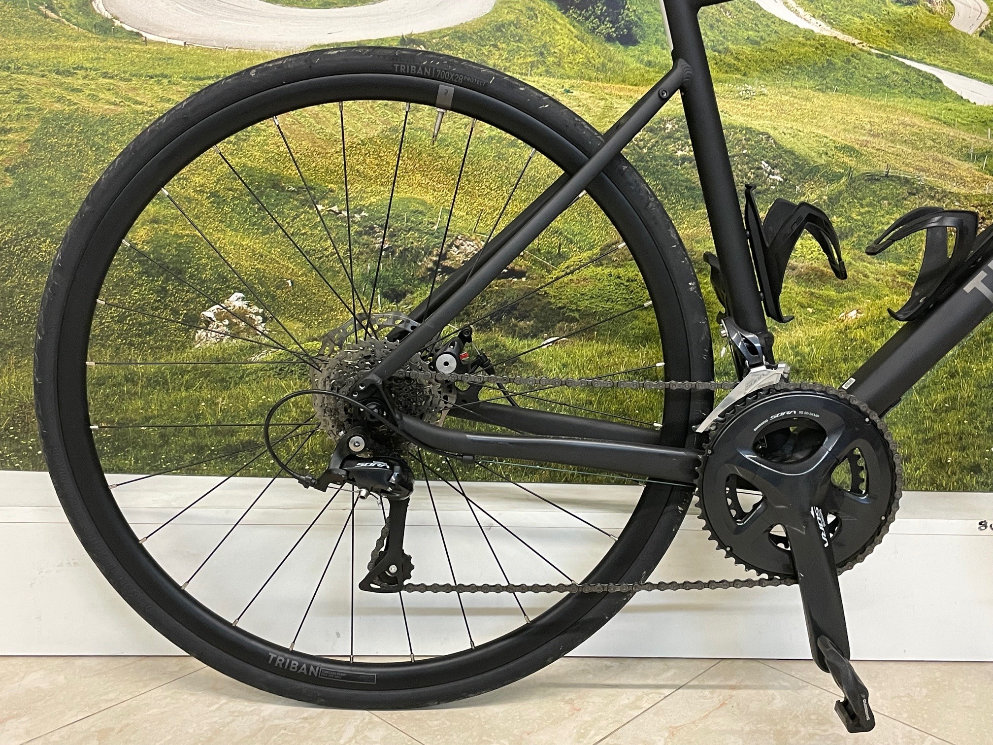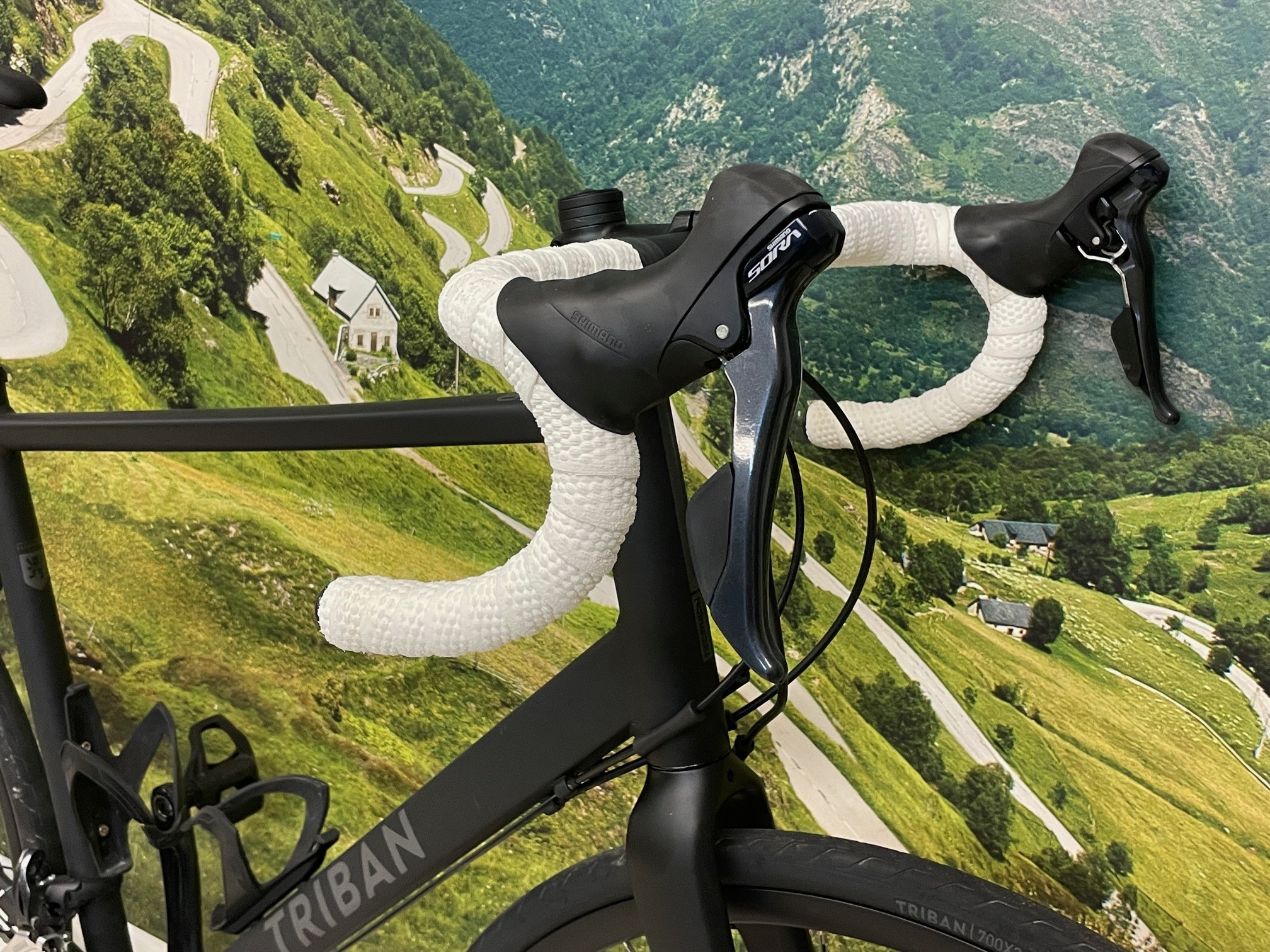 La Triban RC 500 è montata con gruppo Shimano Sora R3000 a 9 velocità e ruote Triban